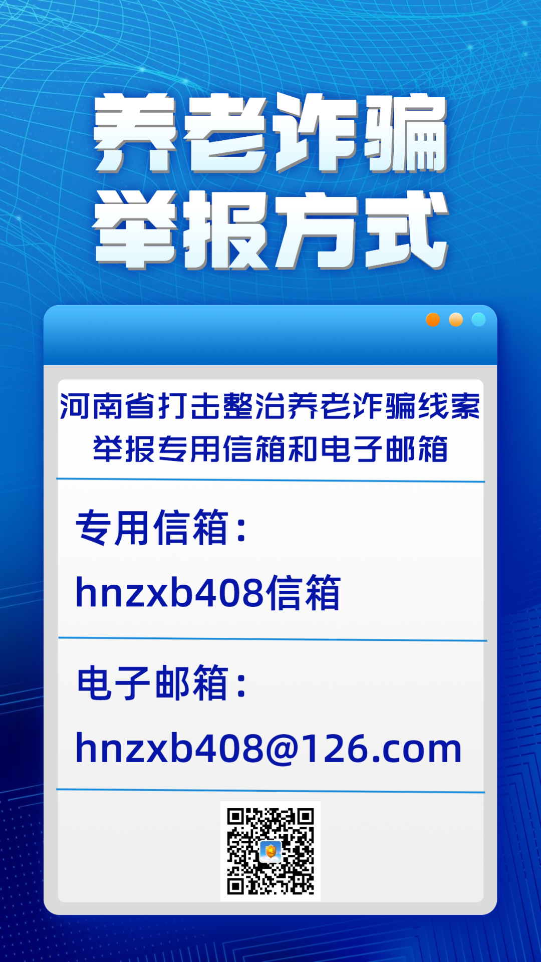 河南省打击整治养老诈骗线索举报专用信箱和电子邮箱分别是hnzxb408信箱、hnzxb408@126.com。