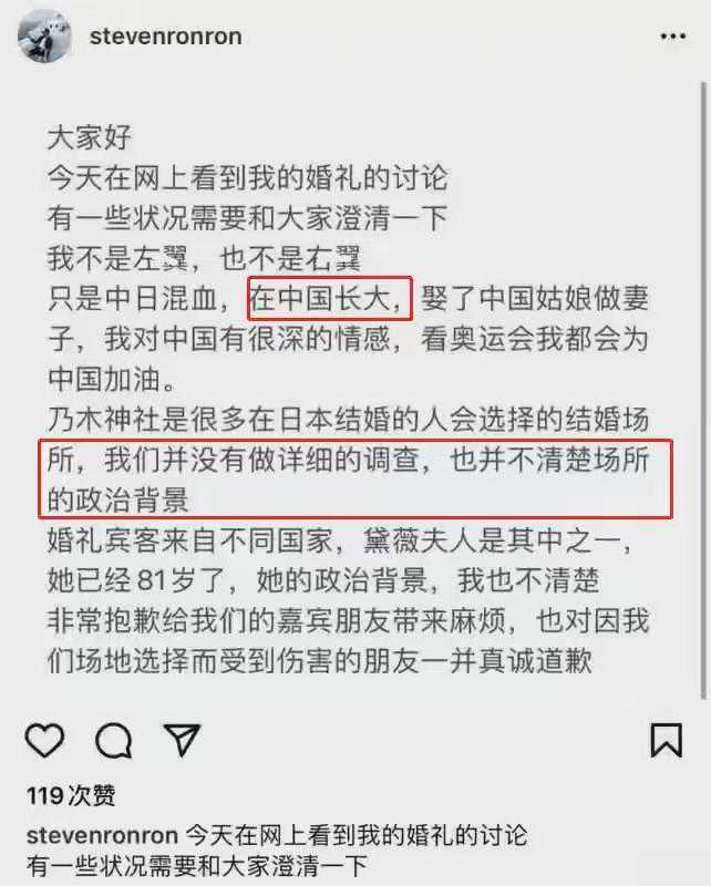 8月13日,张哲瀚的朋友,即婚礼上的新郎在社交平台上回应了,他称自己在中国长大,对中国有很深的感情,至于婚礼的场所,他们并没有做详细的调查,更不清楚那里的政治背景。这个解释似乎能说得过去,但与新娘曾在社交平台分享的婚礼筹备过程对比一下,就能发现漏洞百出。