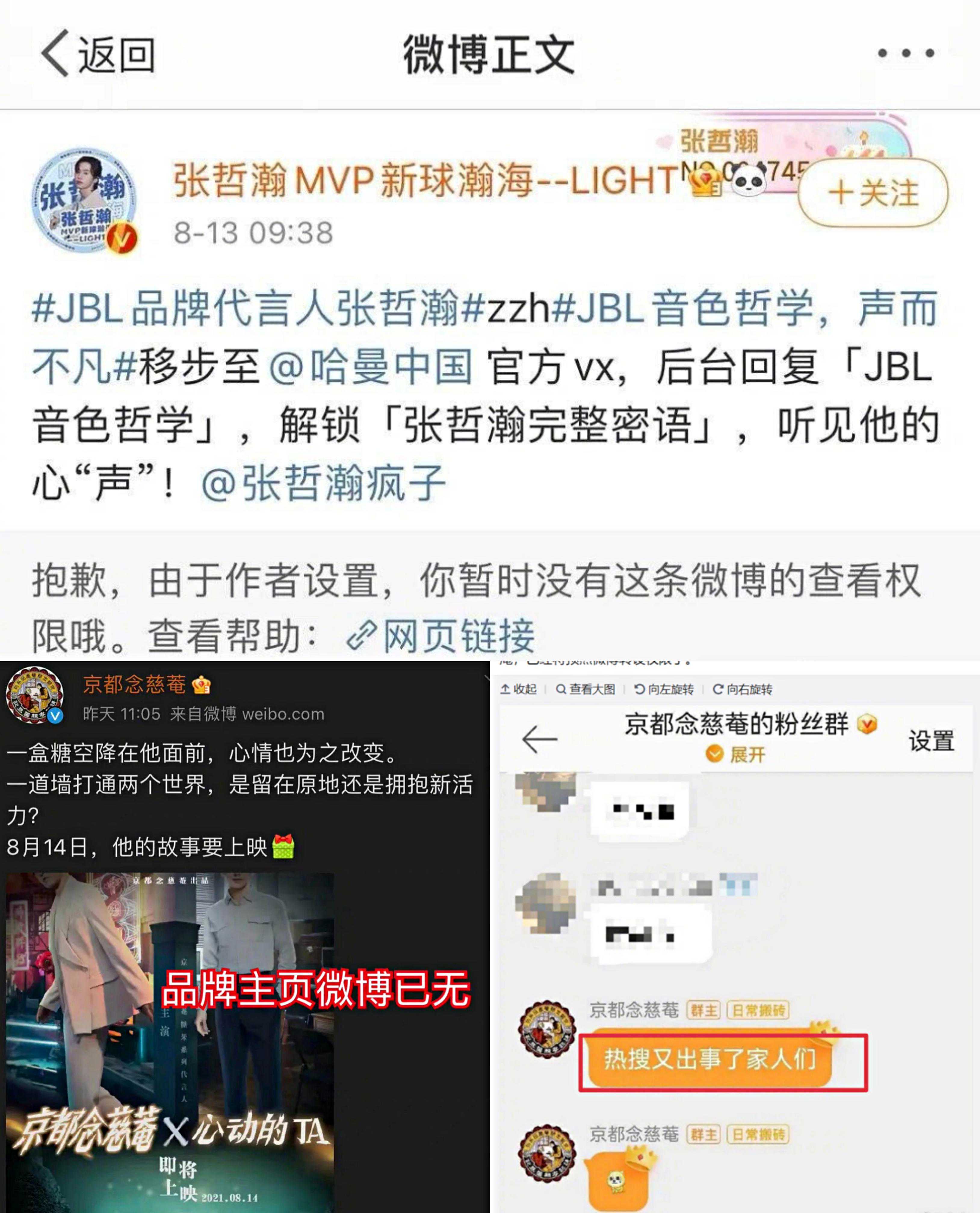 原定于8月14号正式官宣张哲瀚为代言人的品牌京都念慈庵,也已经删除了之前的预热博,并在群里表示“出大事”了,看来明天的官宣,粉丝们是等不到了。
