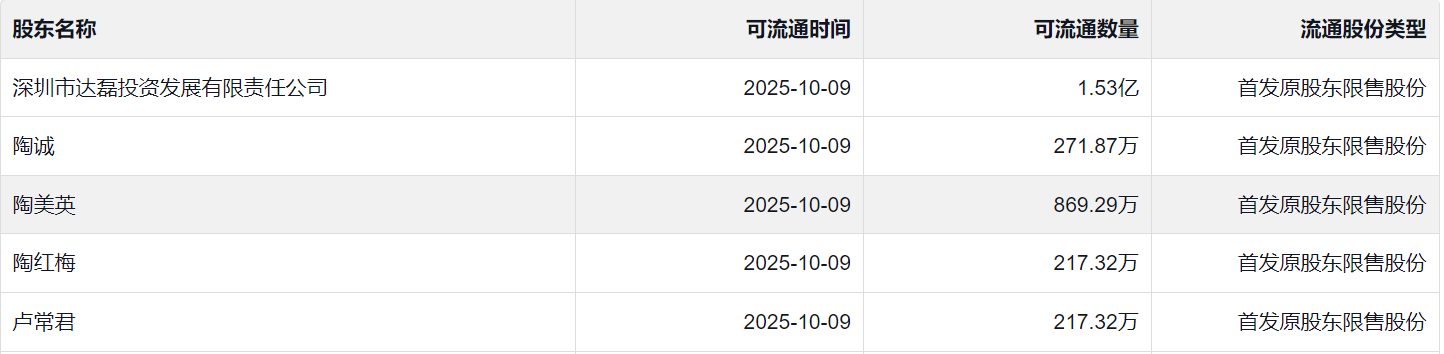 铭利达公告显示,本次权益变动所涉及股份均为首发前限售股,且不存在尚未了结的诉讼、仲裁、争议、司法冻结或者质押及其他限制的情形。作为公司股东,陶诚、卢萍芳、陶美英、陶红梅、以及卢常君,当前持有的股份均为首发原股东限售股份,解禁期为2025年10月9日。