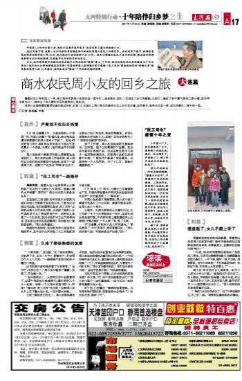 商水农民周小友的回乡之旅(原载《大河报》2011年1月26日A17版,大河特别行动,十年陪伴归乡梦)