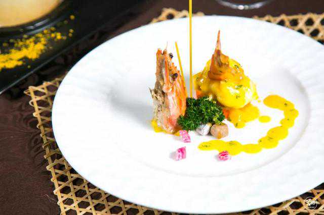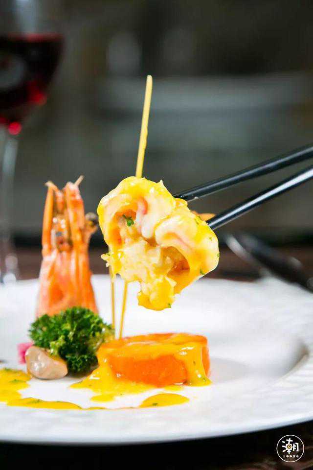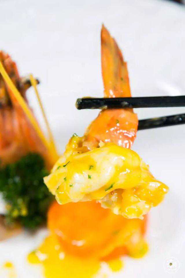 香草汁大明虾属于一道粤菜,也体现了大厨多样的烹饪水准。把大虾去壳后,在锅里过过水,等至烧熟捞出,一点也没有破坏它的美感。