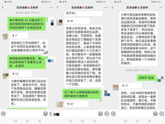 季先生与红娘的沟通记录。表达不满后,对方向他推荐了另一项68800元的服务。受访者供图