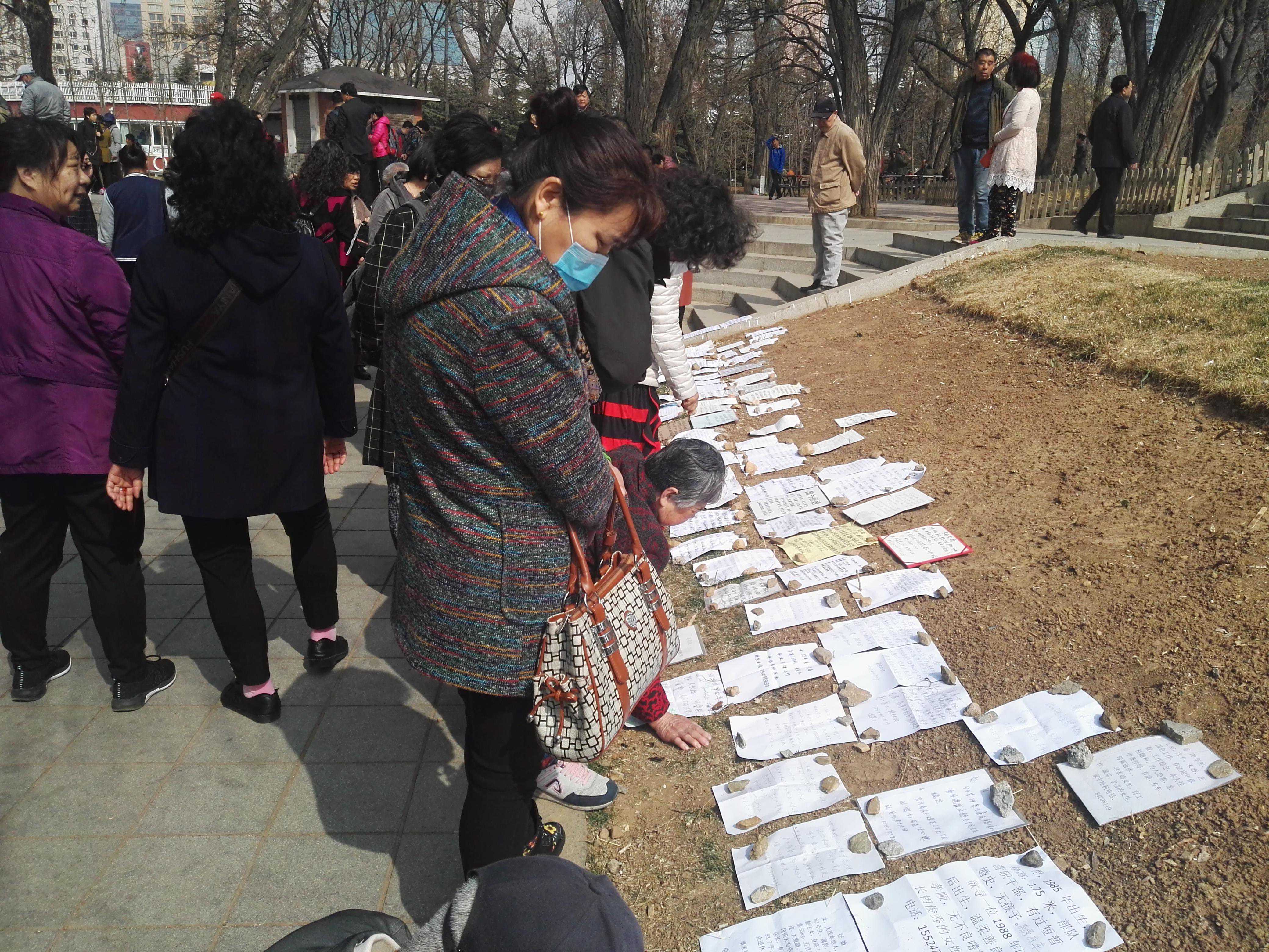 前几年一开始是零星的父母,自发的聚集在公园的一偶,拿着儿女的征婚广告,利用周末游园人多的优势,为儿女征婚。