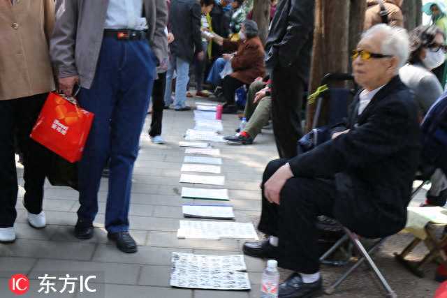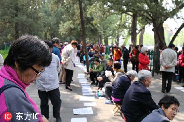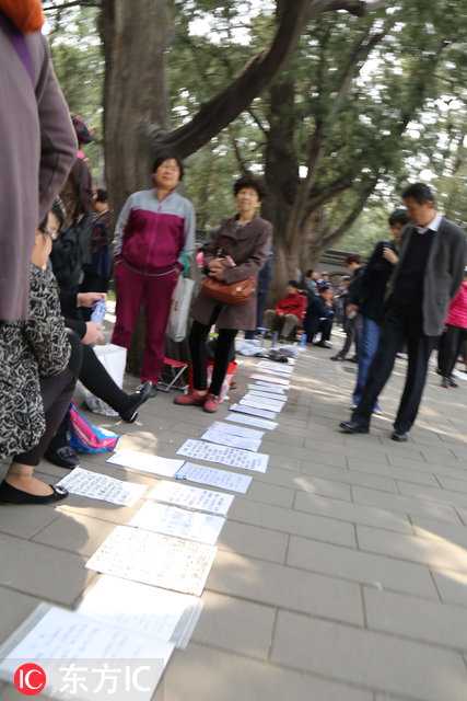 2017年4月9日,北京,北京中山公园“相亲一条街”上放满征婚简历。相亲者多是手持征婚简历的子女们的父母。(图片署名:东方IC/王徐)"