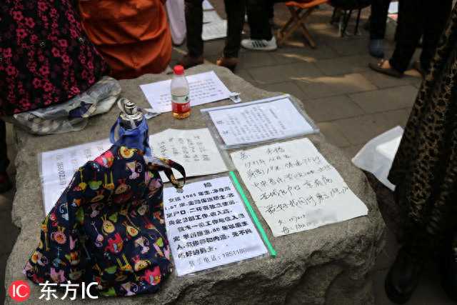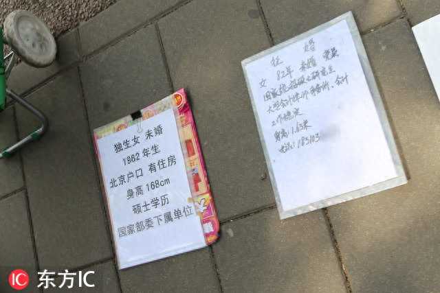 2017年4月9日,北京,北京中山公园“相亲一条街”上放满征婚简历。相亲简历上多为大龄未婚青年。(图片署名:东方IC/王徐)"