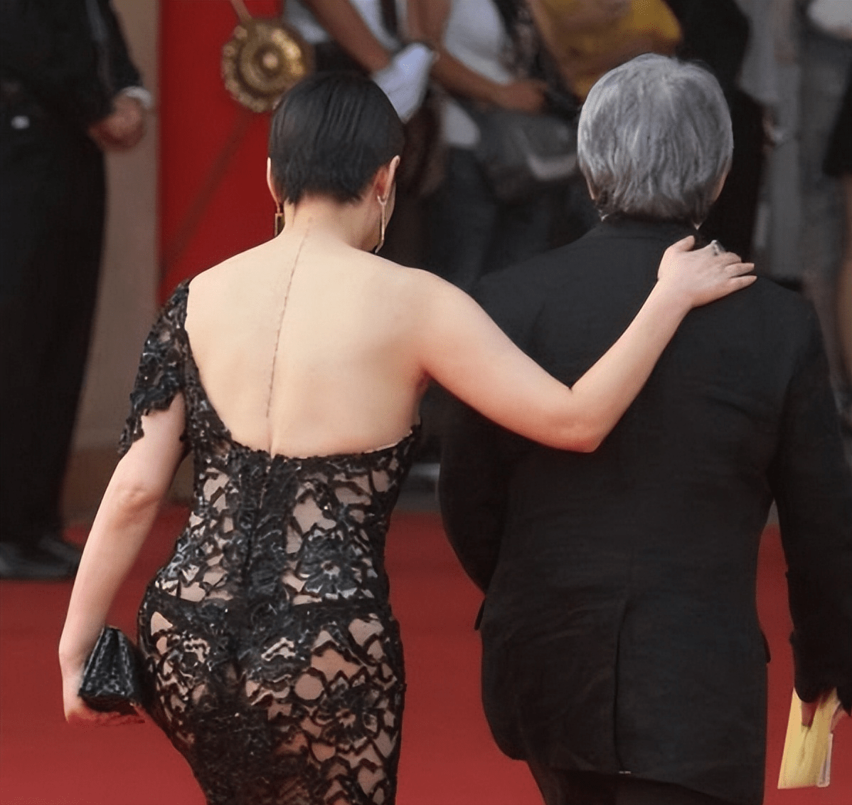 远远看上去,她仿佛也穿了件黑色蕾丝裙,这件裙子除了“长度”和“袖子的设计”两个部分,几乎与章子怡身上的那件一模一样。
