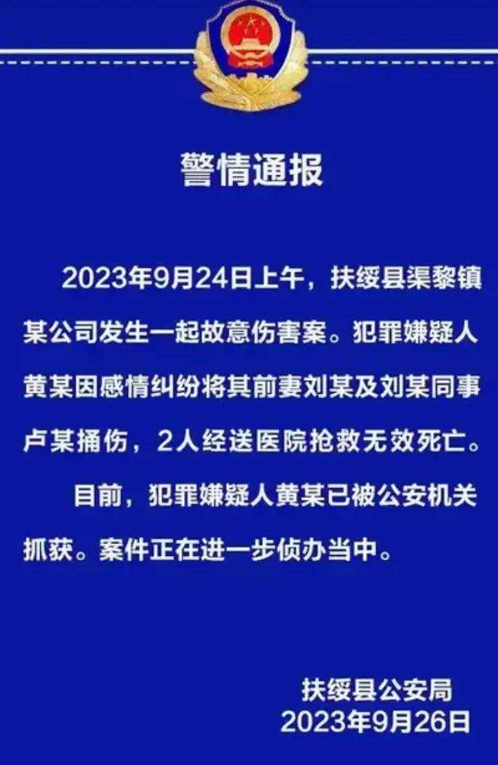 9月24日,广西崇左市扶绥县发生一起杀人案,犯罪嫌疑人黄某杀害前妻刘某及前妻的同事卢某,还有一人陈某胳膊受伤。