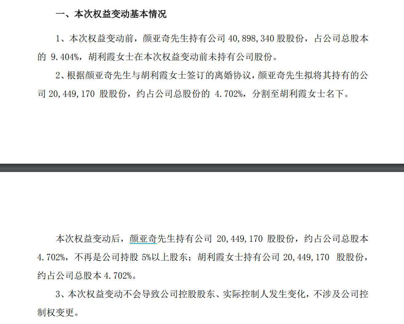 公告提及,权益变动后,颜亚奇持有股份,约占公司总股本4.702%,不再是公司持股5%以上股东。