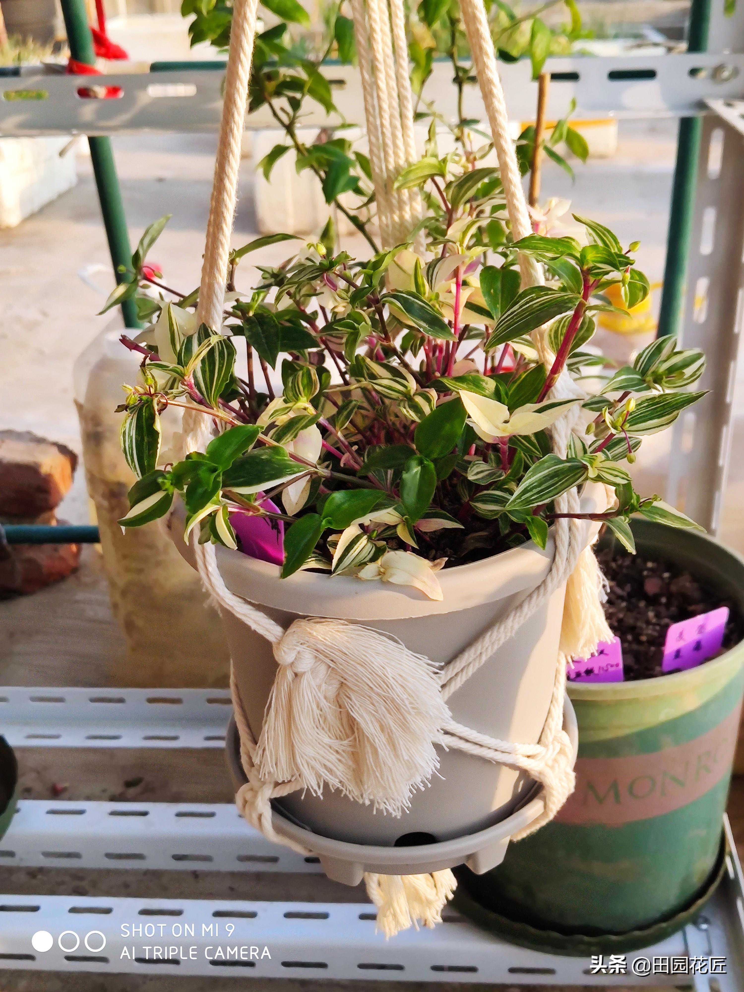 下图就是纠正错误之后养殖了一段时间的婚礼吊兰锦,是不是恢复的不错呀?小编又把它悬挂在楼顶迎接早上太阳了,10点后就会就会把它搬回屋里,楼顶光照比较好通风也好,小编给它编的吊篮绳,是不是很合适呀?哈哈哈~~~