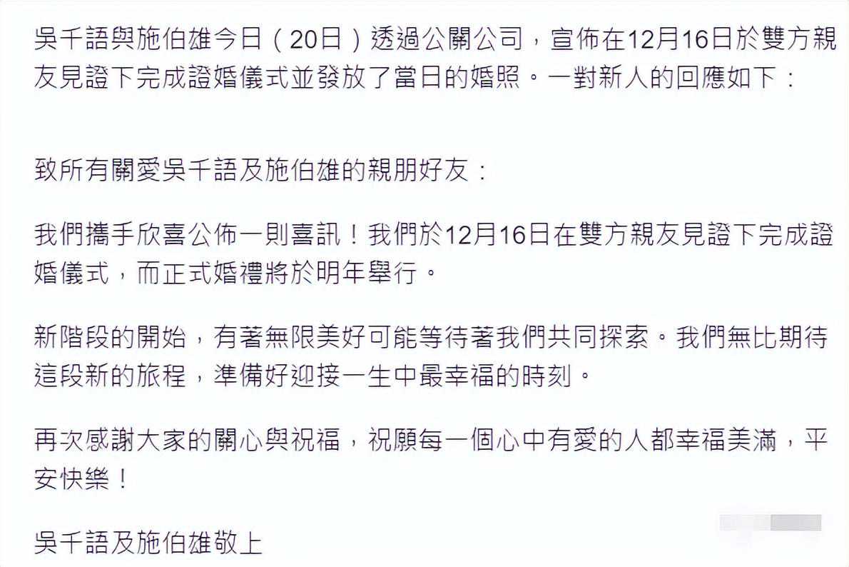 12月20日,吴千语和施伯雄发布了他们的结婚照片,正式宣布两人在16日完成了结婚登记仪式。