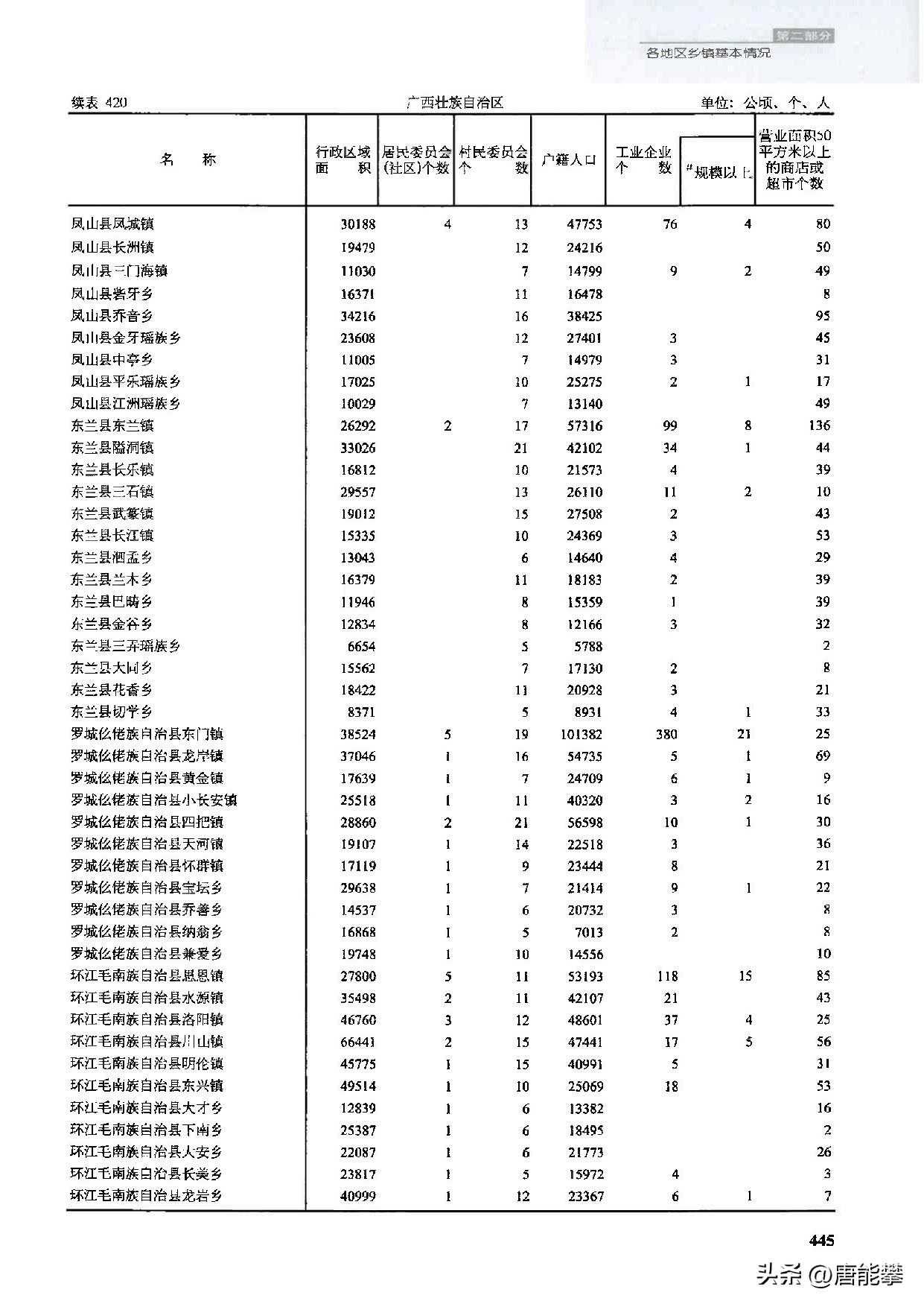 人口密度列:都安县安阳镇1001人每平方公里,最为密集。大化县大化镇位居第二,但只有383人每平方公里。所有乡镇的平均密度为158人每平方公里,具有山区的特征。假设笔者这栋25层2单元2梯5户的大楼每户住2人的话(有的住3-4人,但也有空置率),可以住25*2*5*2=500人。158人每平方公里相当于全镇平均每3平方公里有1栋这样的大楼。