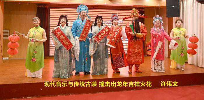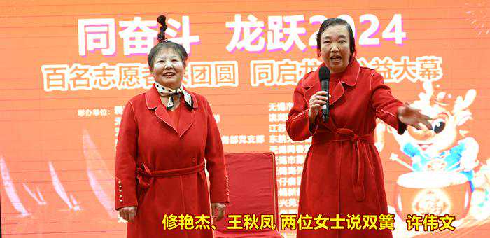 修艳杰和王秋凤两位女士用许伟文写的双簧“过年”剧本,用传统双簧方式,生动的肢体动作,向大家展示了养老院里好伙食;