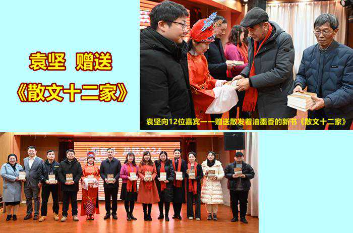 散发着油墨香的12本新书《散文十二家》,由江苏省作家协会会员、散文十二家之一的袁坚,向由许伟文先生特邀的十二位嘉宾一一赠送。