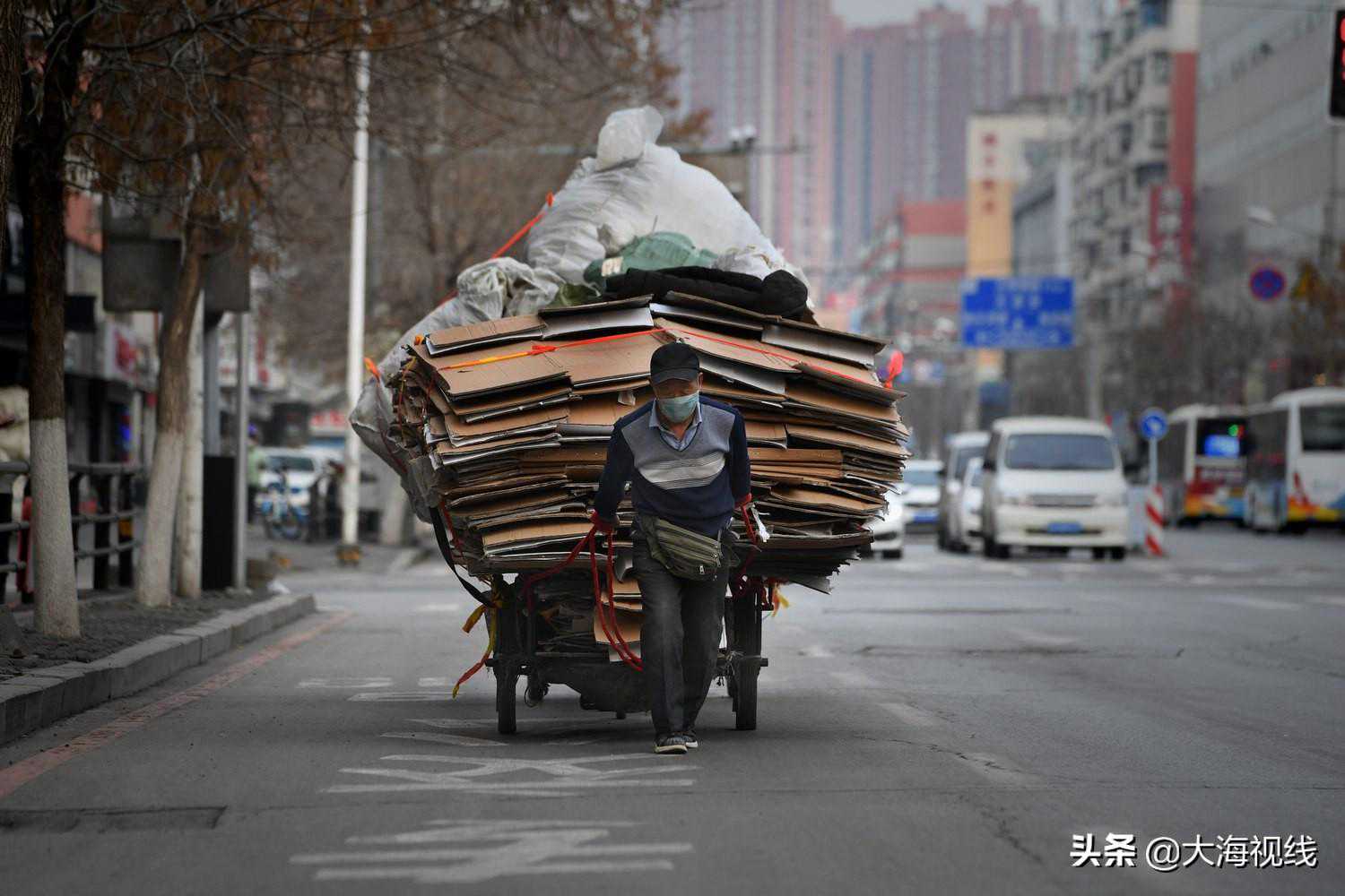 2020年2月29日,一位旧物回收者拉着三轮车吃力地前行。此刻,薄薄的口罩让他感觉到了呼吸困难。