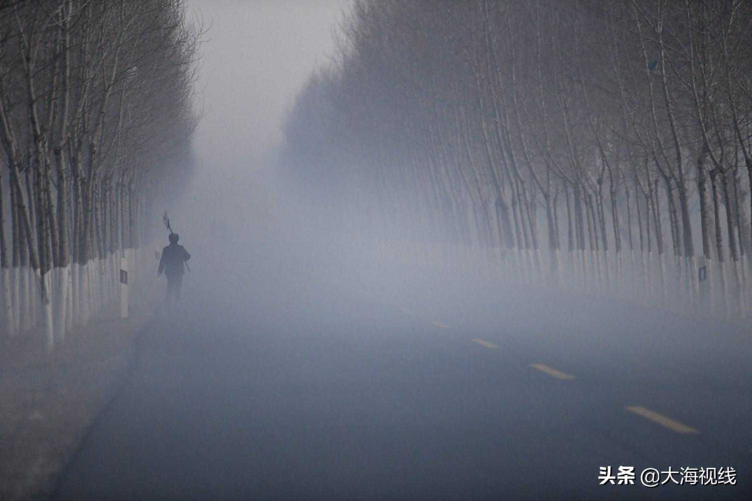 2020年3月17日,在法库县的乡村公路上,一位烧荒者扛着耙子前行。他身旁的烟气弥漫,呛得人窒息。