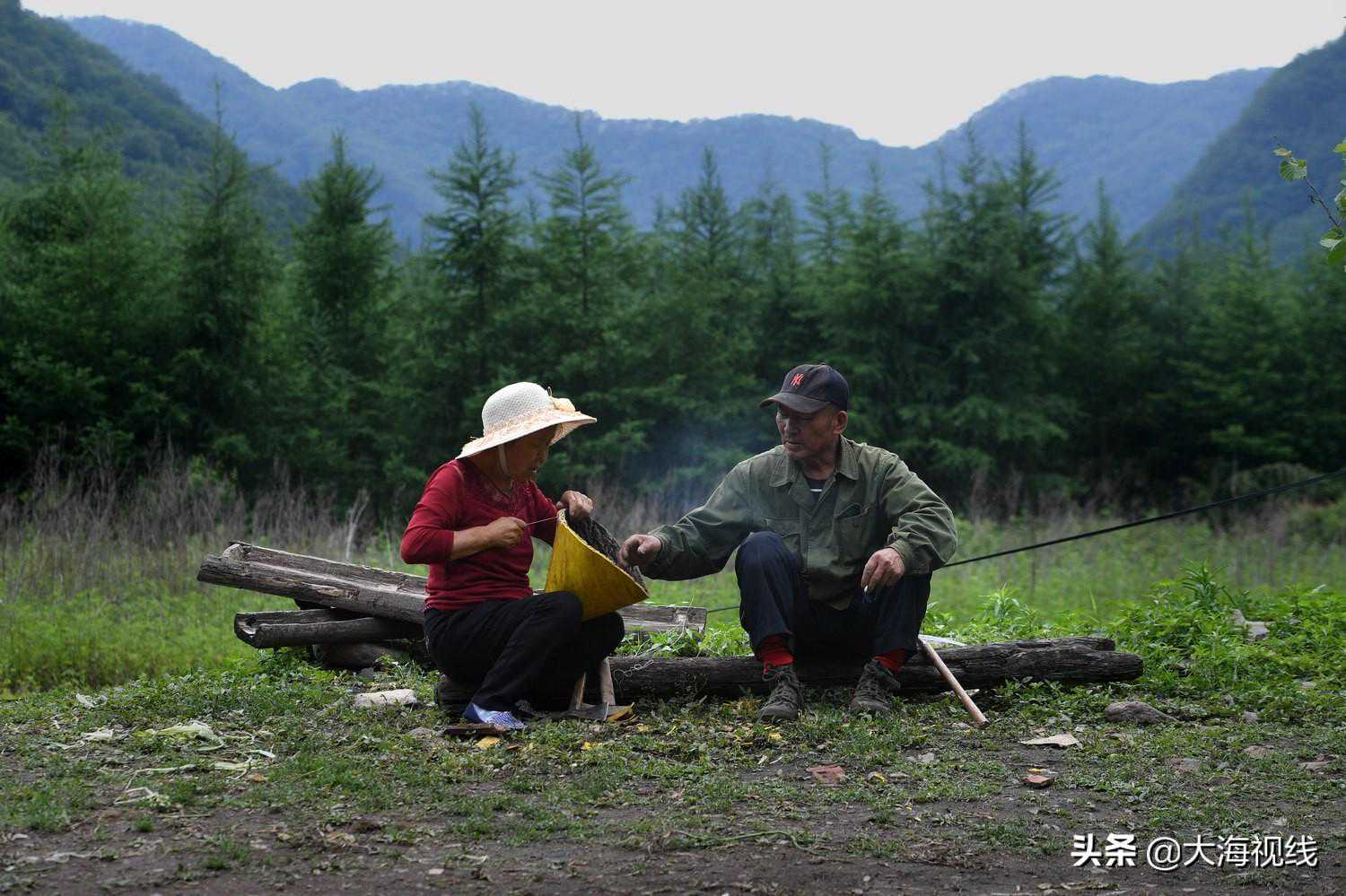 2020年6月26日,本溪县草河掌镇小汤沟村,王玉俭和老伴蒋淑荣坐在大山前制作蜂帽。方圆几十里范围内,只剩了这一户人家。