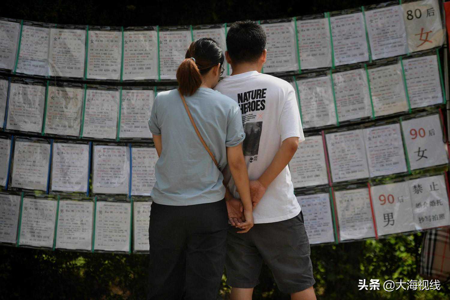 2020年8月29日,南湖公园西门附近,一对情侣相拥而立,全神贯注地看着眼前的征婚信息。