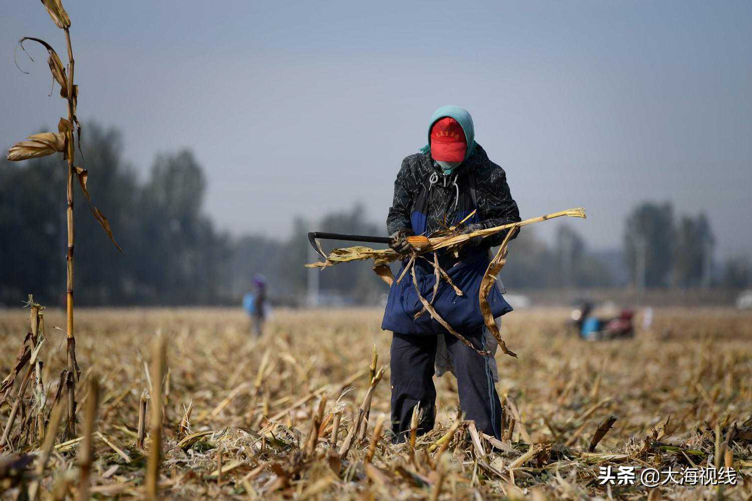 2020年10月14日,沈阳城南的田地里,一位捡粮人将一穗玉米从秸秆上掰下,放入腰间的口袋里。