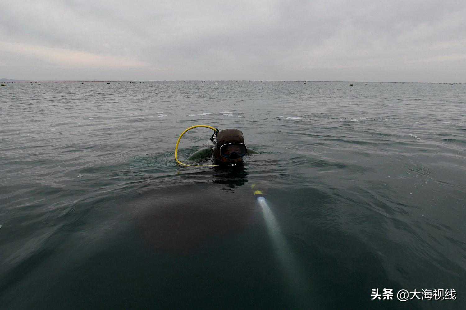2020年11月21日,大连长海县海域,海参捕捞者迟东辉浮出水面。二十年前,他从黑龙江举家搬至此地。