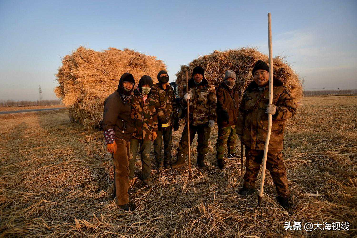 2020年12月29日,52岁的张魁斌和工友们一起站在镜头前,他们来自辽中,承包了这片田地的稻草运输工作。