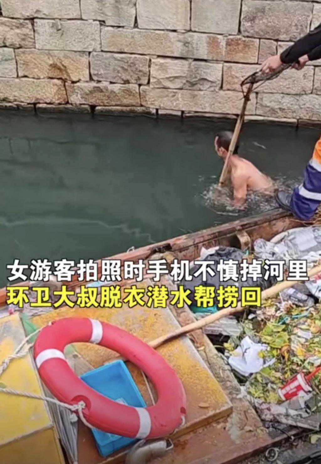 10月3日,江苏苏州。一名女游客拍照时不慎将手机掉进河里,环卫大叔脱下衣服潜入水中帮忙捡回。摄影师叶先生称,女子不停地说谢谢,还给叔叔发了几百元红包。叔叔终于收下了红包。他觉得叔叔是一个非常好的人。
