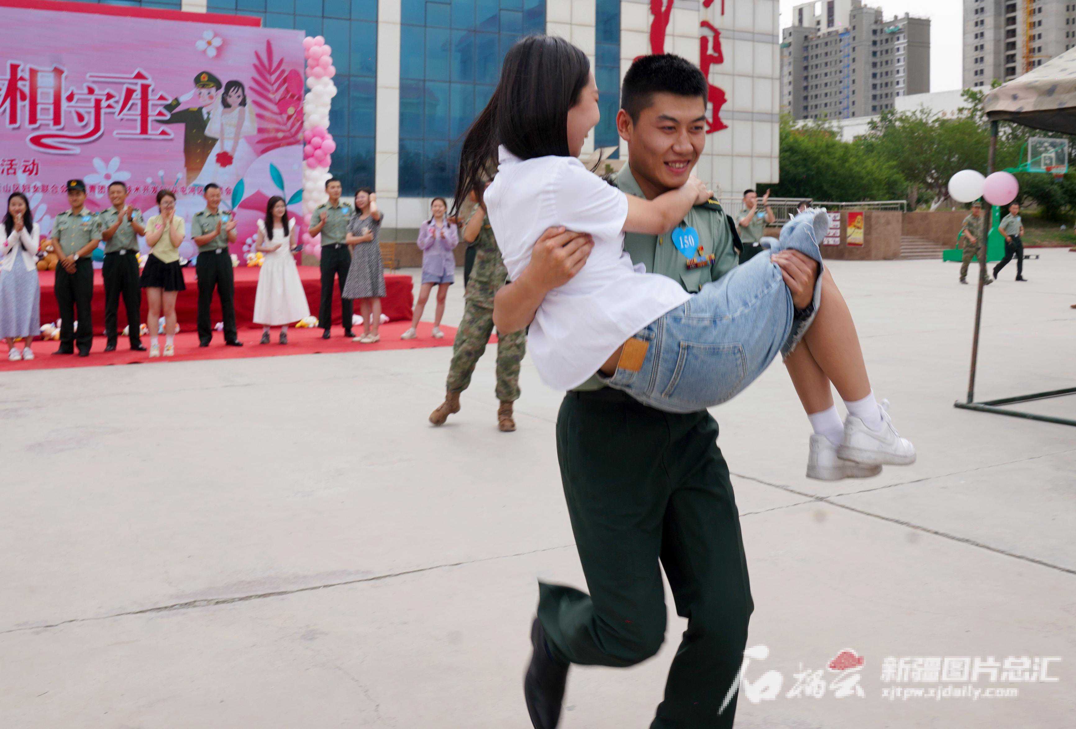 7月28日,在军地青年联谊交友会互动游戏中,男嘉宾用公主抱方式和女嘉宾成功过关。石榴云/记者王琦铭摄