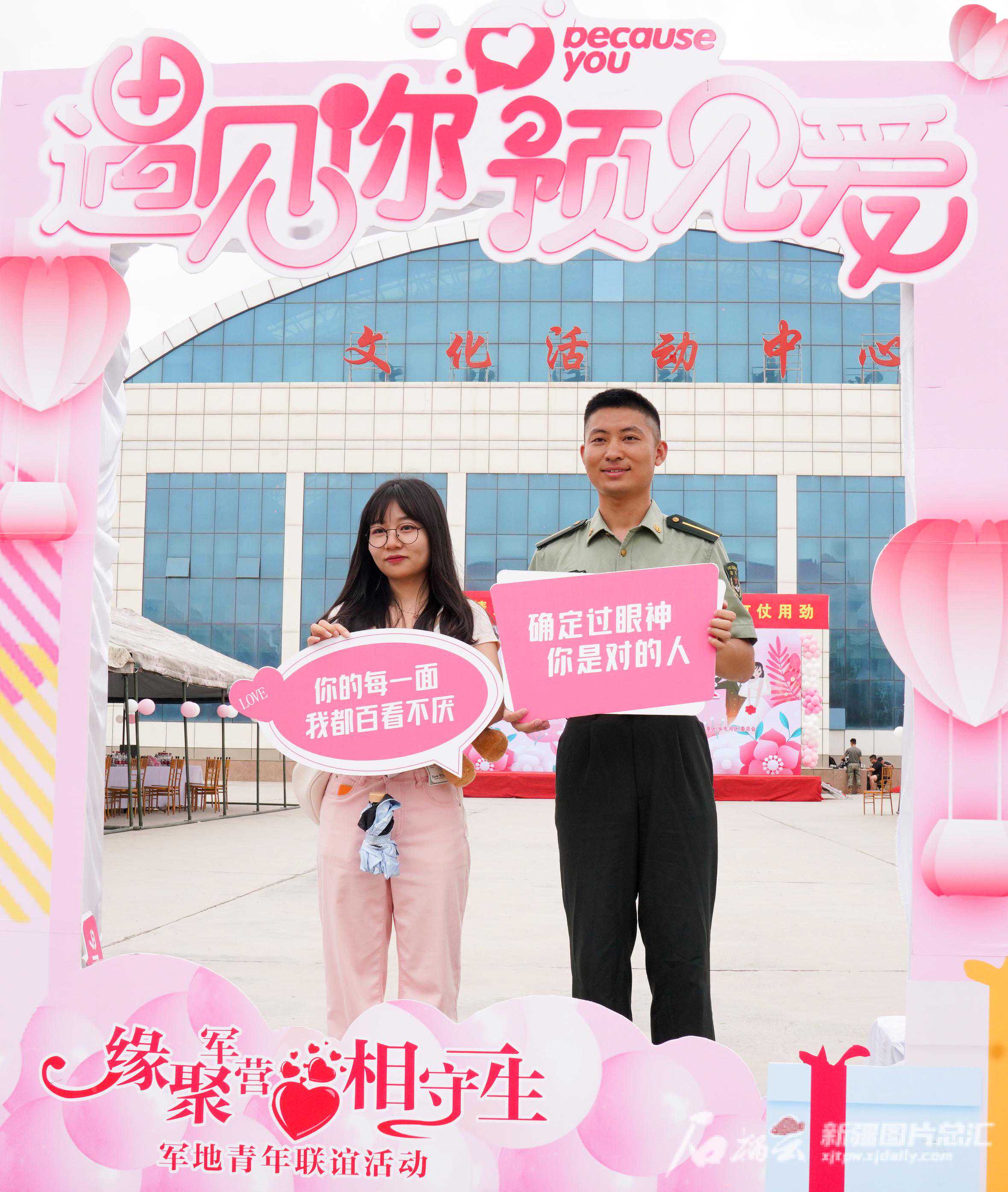 7月28日,在军地青年联谊交友会结束后,两位军地青年在精心布置的合影区“打卡”。石榴云/记者王琦铭摄