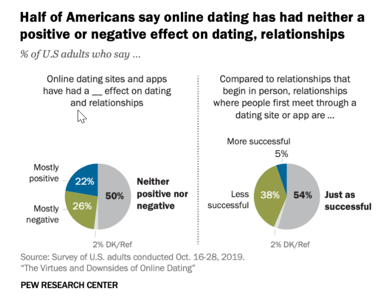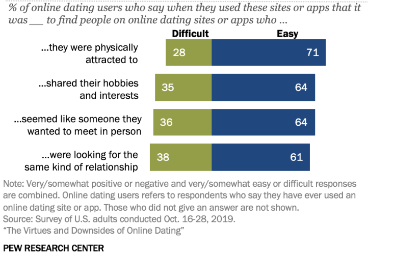 另外,尽管存在与在线约会相关的问题,但57%的用户表示曾有过积极的经历,42%的表示有一些负面经历。