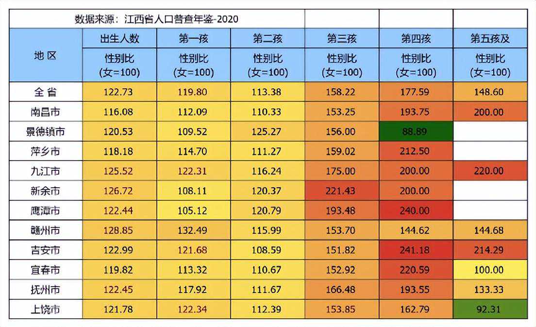 细细拆解到江西省各城市各孩次的新生儿性别比,就会发现这简直是一个全方位无死角的重男轻女大省——