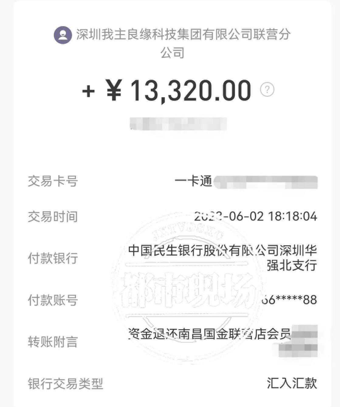 刘女士当时也果断回复:如果不退一万三千元,她会继续上门维权。最终,在6月2日下午6点多,刘女士收到了深圳我主良缘科技集团有限公司联营分公司退回的13320元。