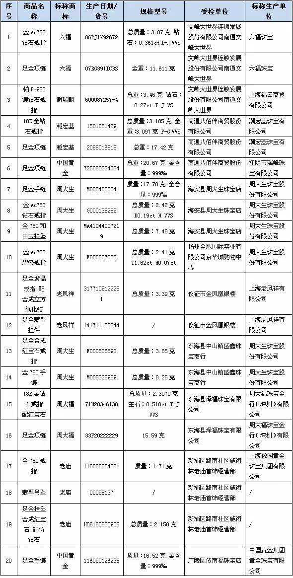 合格产品涉及标称商标周大福18K金钻石戒指配红宝石、六福金Au750钻石戒指、老凤祥足金翡翠挂件、谢瑞麟铂Pt950镶钻石戒指、潮宏基18K金钻石戒指、周大生足金手链、老庙翡翠吊坠、中国黄金足金手链等169批次,合格率为50.4%。