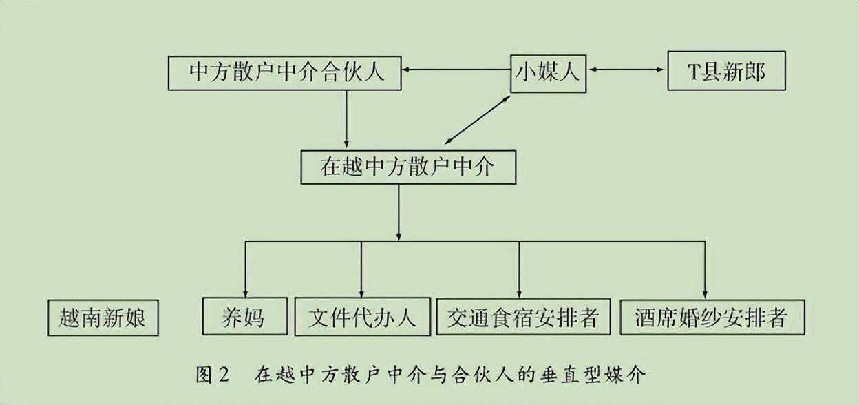 在越中方散户中介与合伙人的垂直型婚介是指在越中方中介合伙人与在越中方散户中介合作,通过挖掘双方需求、确定服务对象、安排相亲、办理结婚手续的流程,以角色多元且垂直分工的跨地区经营方式进行婚姻介绍的过程。这种模式的婚介者间具有血缘或地缘关系,多限于兄弟、夫妻或中国越南华侨农场成员间,实行垂直的组织分工流程,凸显了侨乡跨国华侨关系网络的作用。我们将以在越中方散户中介合伙人J①、在越中方散户中介P②、小媒人Y③介绍中国新郎M④婚姻的案例进行阐述。