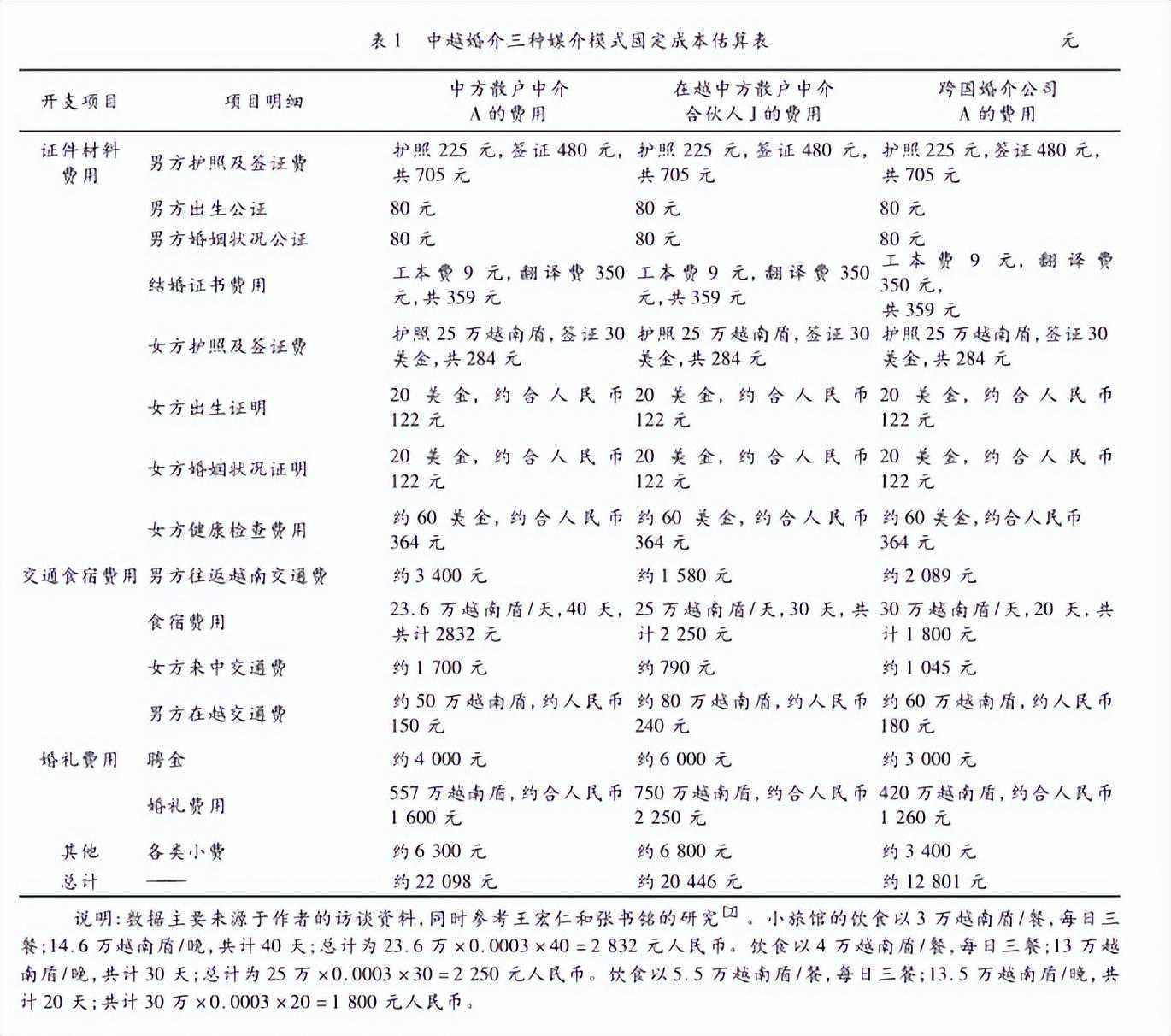 这些婚介费用中婚介者的收益到底有多少,我们分别通过对中方散户中介A、在越中方散户中介合伙人J、中越婚介组织中跨国婚介公司A的例子核算其婚介费的固定成本,进而再估算收益。中方散户中介A整个项目费用为22098元,其中,证件材料费用为2116元,占比为10%;交通食宿费用为8082元,占比为36.5%;婚礼费用5600元,占比为25%;其他费用6300元,占比为28.5%。