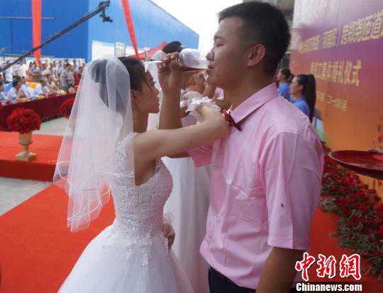 郑万铁路是郑渝高铁的重要组成部分,同时也是联系中原地区和西南地区的主要高速客运通道。图为新人们在郑万铁路施工工地举办集体婚礼。邓兵摄