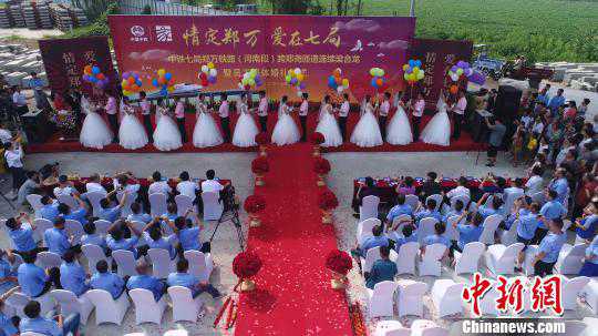 8月11日上午,10对新人在中铁七局承建的郑万铁路河南段ZWZQ-3标段举行工地集体婚礼。作为郑万铁路的施工建设者,新人们让颖河特大桥跨郑尧高速匝道连续梁合龙见证爱情,将婚礼礼堂搬到郑万铁路建设工地,在亲朋好友、同事以及铁路周边村民的祝福声中,共同携手走进婚姻殿堂,把人生最幸福的时刻定格在热火朝天的铁路建设工地。