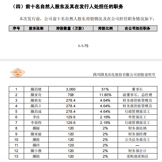 公司上市解禁以来,前十大流通股东名单中,鲜有机构的身影。据悉,国光股份虽上市多年,但家族企业特征依然明显。虽目前在高管团队中仅有颜亚奇一名颜氏家族成员,但据其首发招股书来看,公司家族成员在采购部、公关法务部、行政部以及财务部等各大业务线上身居要位。