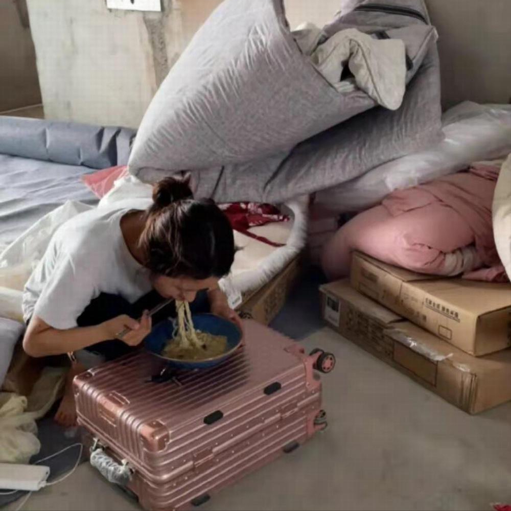 刚开始住进去时,我还没钱买桌子,所以我都是把自己的拉杆箱放倒,拿来当桌子吃饭。