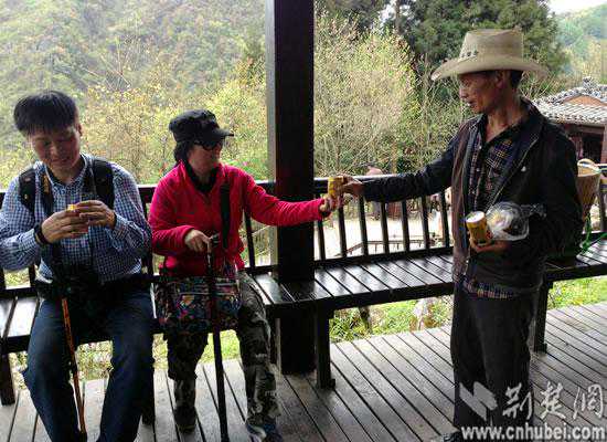 背篓哥刘成松在恩施大峡谷请游客喝饮料