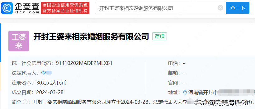 值得注意的是,近期,开封王婆被注册为婚介所。