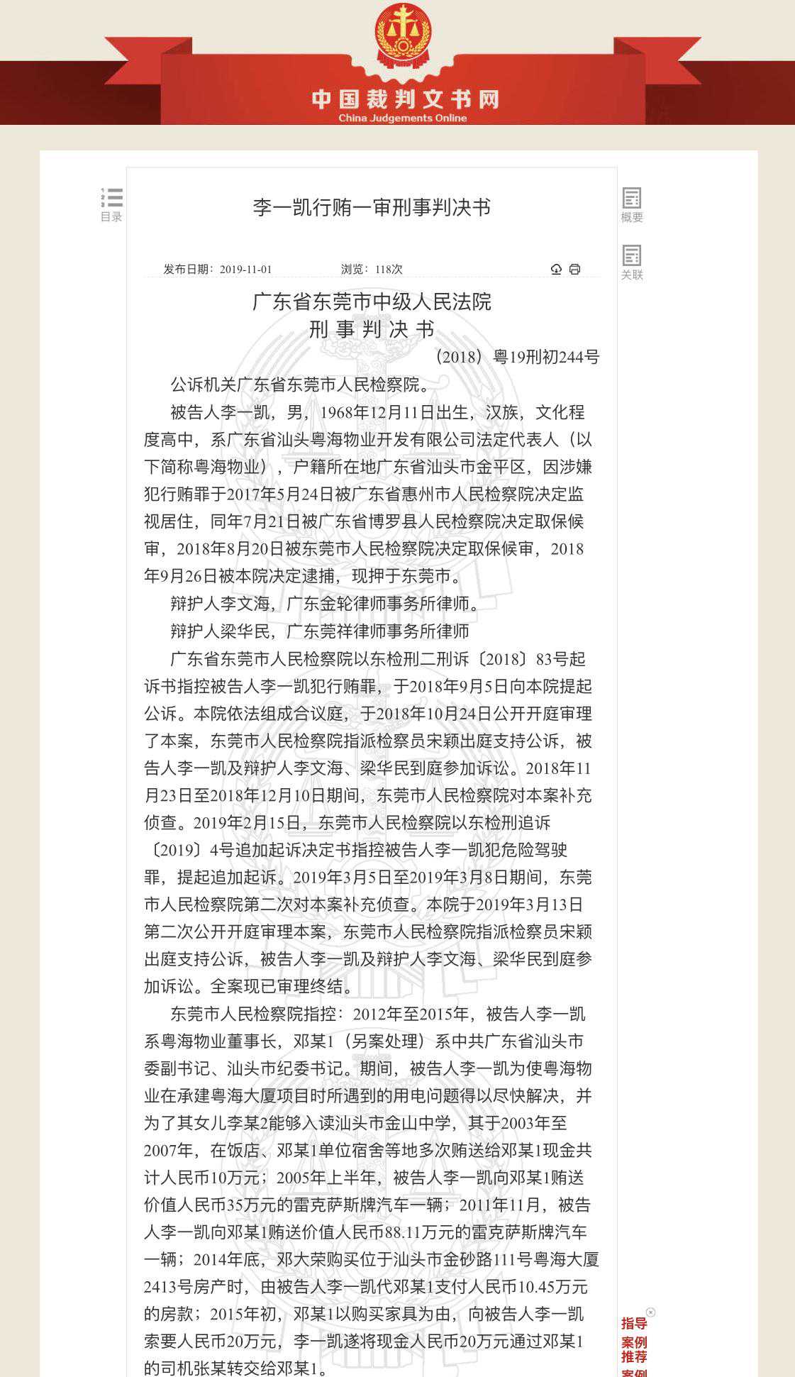 李一凯行贿一审判决书。