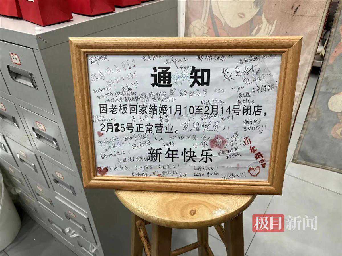2月29日,经营店面的小夫妻告诉极目新闻记者,收到路人的祝福很意外也很幸福。这份写满祝福的通知已经装裱好挂在店里,为了感谢大家,开业后他们已经发放了300份喜糖。