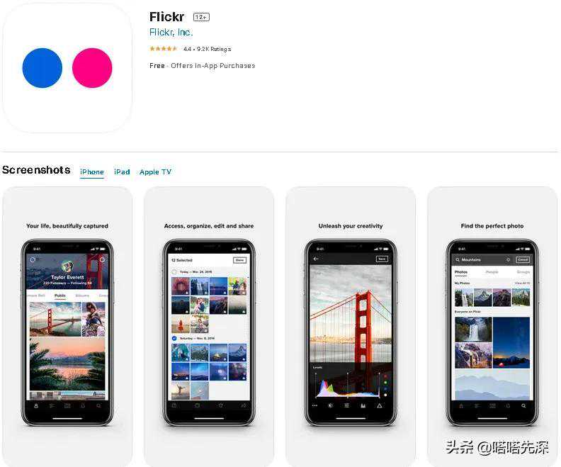 Flickr,雅虎旗下图片分享APP,于2004年2月由Ludicorp公司创建的一个Web服务套件和在线社区(Flickr前身),雅虎于2005年收购Flickr。Flickr提供全面的、一流的、高效的图片服务,包括图片的上传与存放、分类、加标签(Tag)、图片搜索等。除了在Flickr上分享私人照片外,Flickr也可作为网络图片的存放空间,其创新的线上社群工具,能够将个人照片标上标签(Tag)并且以此方式浏览。据雅虎报道,在2011年6月,Flickr共拥有51万注册会员和80万独立访问者。据2011年8月Flickr报告,Flickr存储了超过6亿的图片,并且这个数字还在稳步增长。