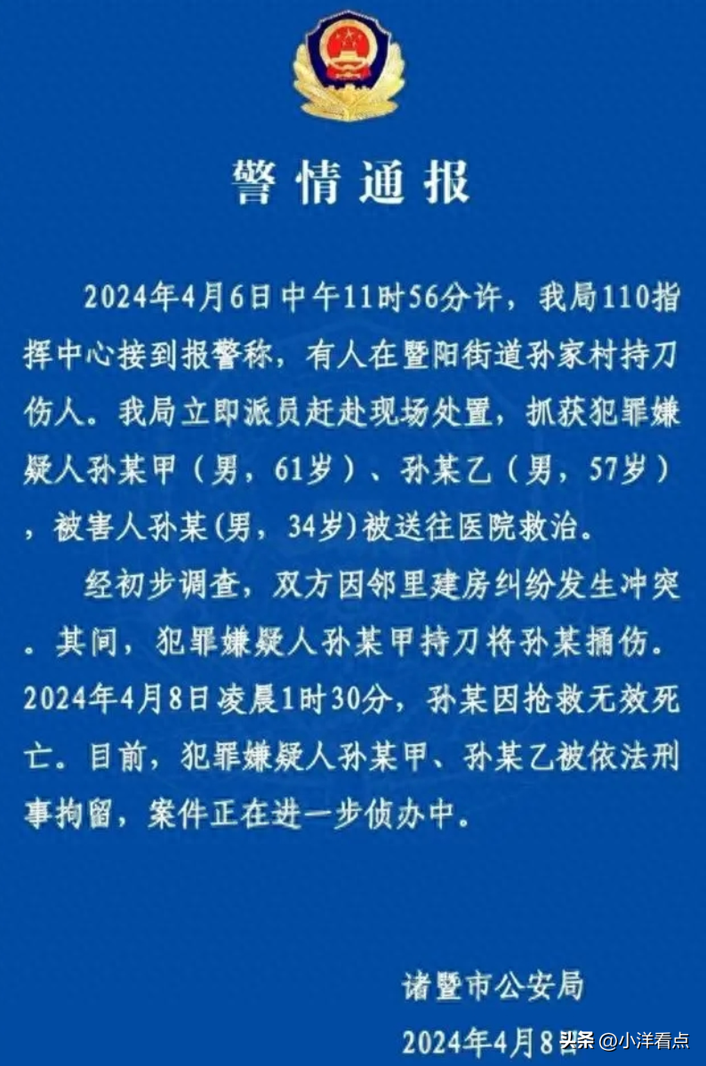 浙江暨阳警方通报显示,4月6日,34岁的孙沪在家乡遭到61岁的孙某甲和57岁的孙某乙持刀捅伤。短短两天后,年轻有为的孙沪便与这个世界永别。"就因为一点小纠纷,就动了这等杀机。"