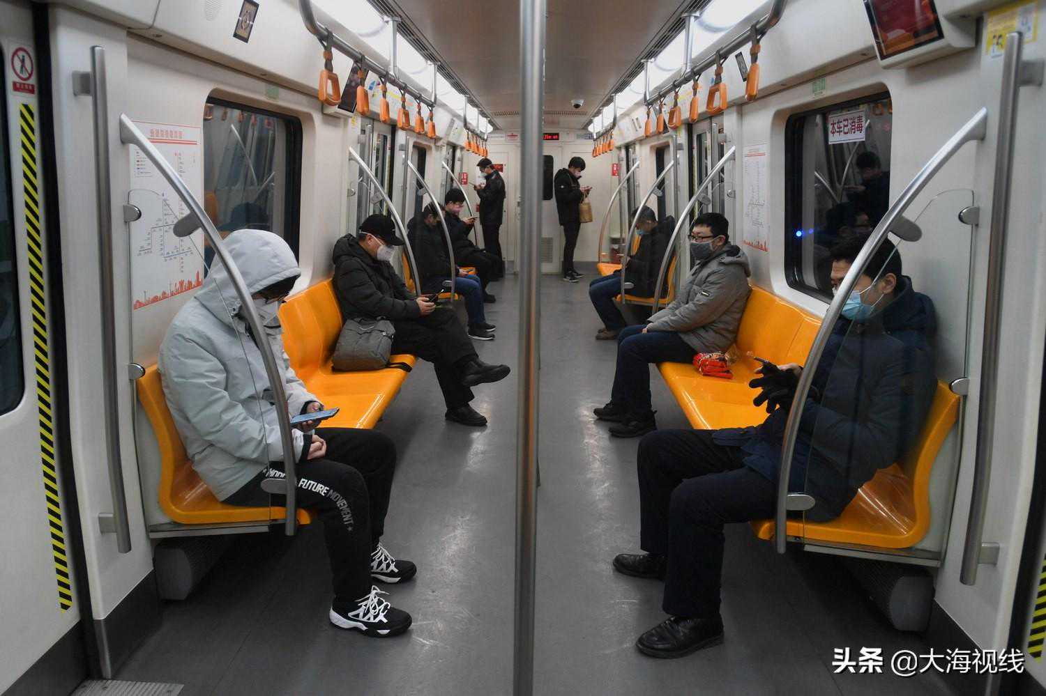 2020年2月22日,沈阳地铁一号线内,出行的市民都戴上了口罩,保持距离而坐。此刻,世界变得冰冷。