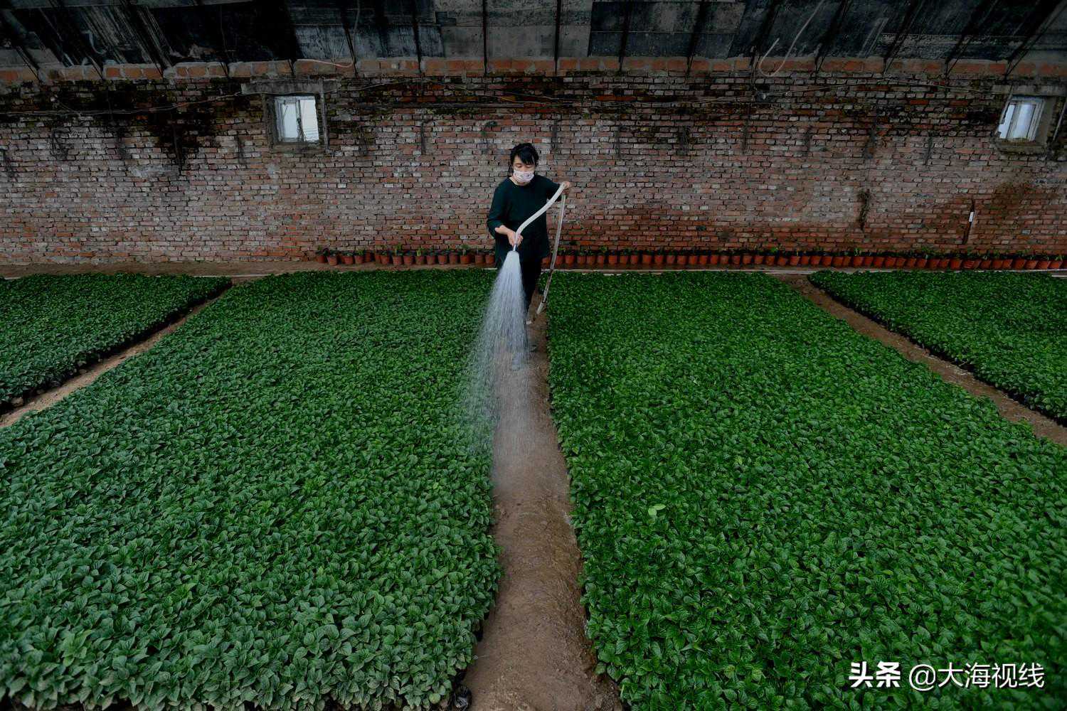 2020年3月25日,吴八家子花卉基地,花农范淑清给花苗喷水。二十年前,她实现了从粮农到花农的转变。