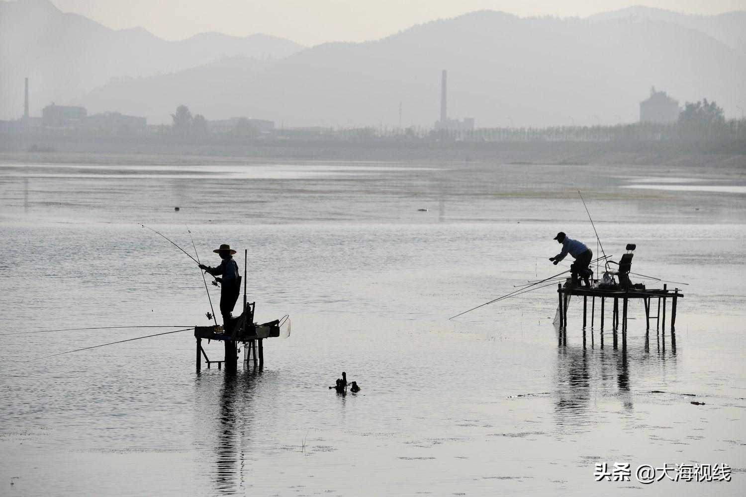 2020年6月20日,太子河本溪流域,两位钓友坐在各自的钓台上抛竿垂钓,看上去悠闲自在。