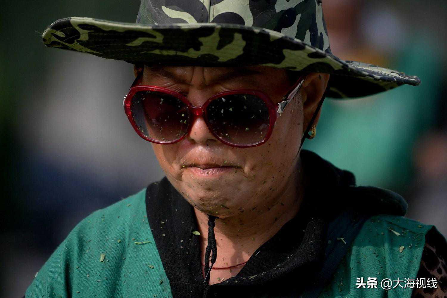 2020年7月15日,沈阳长白岛内河畔,一位打草女工的身上溅落着草叶,脸上满是汗水。