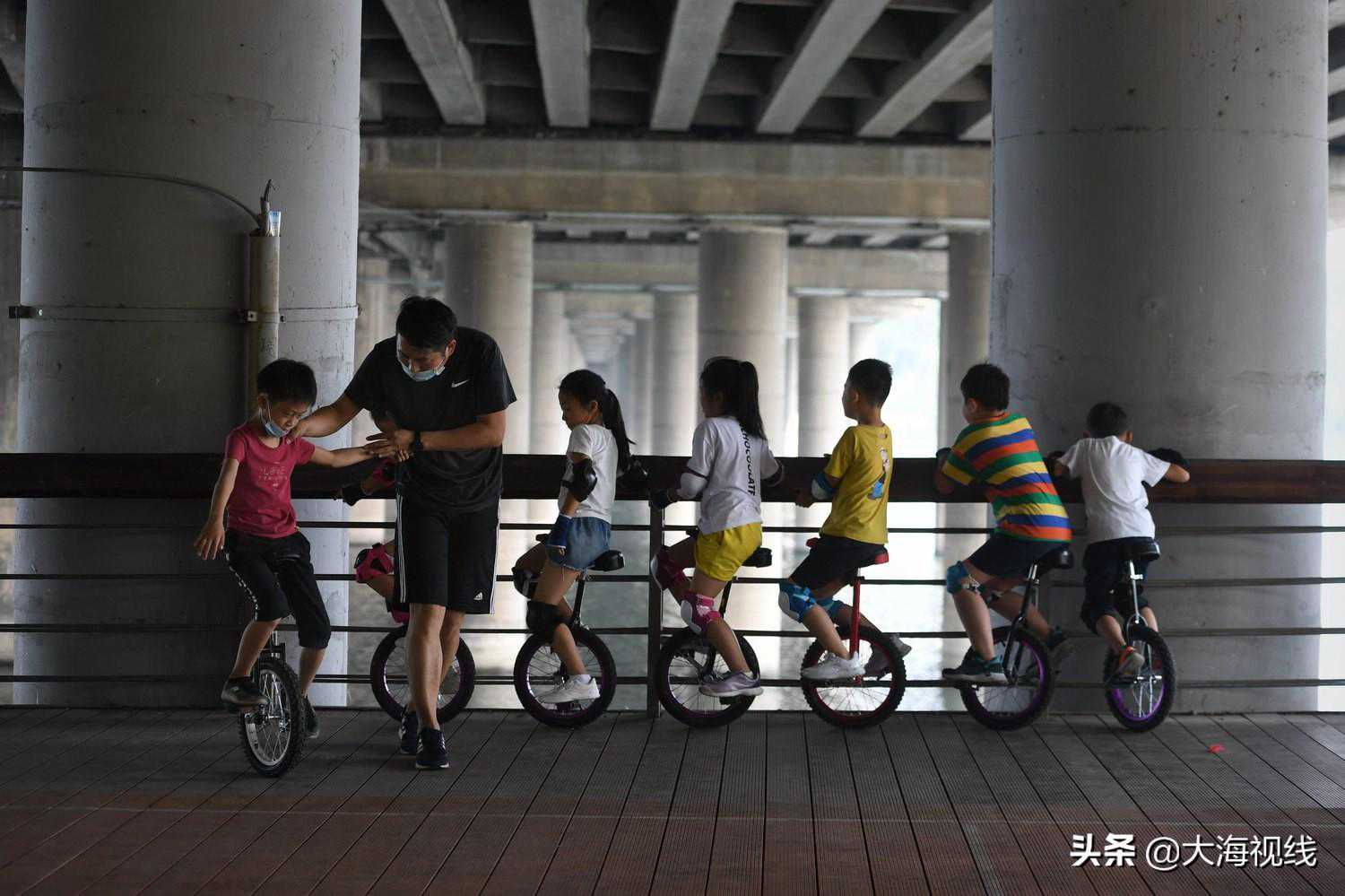 2020年7月15日,南京桥桥下,几位小朋友扶着护栏坐在独轮车上排队,等待教练指导骑行技巧。