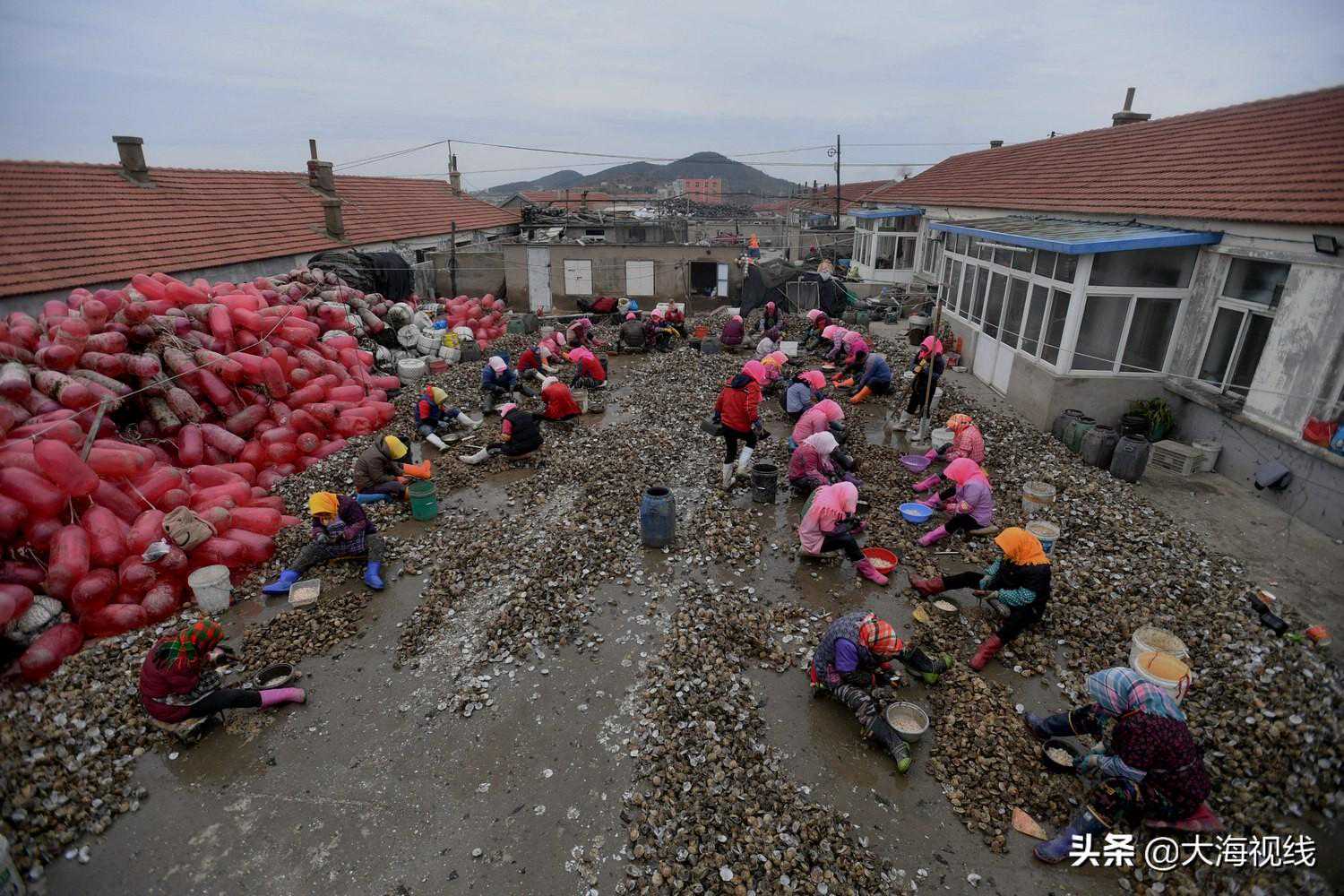 2020年11月21日,在大长山岛临海屯村,众多打工者坐在一渔家院落里,抠取海湾贝的贝肉,抠取一斤将有五块钱收入。